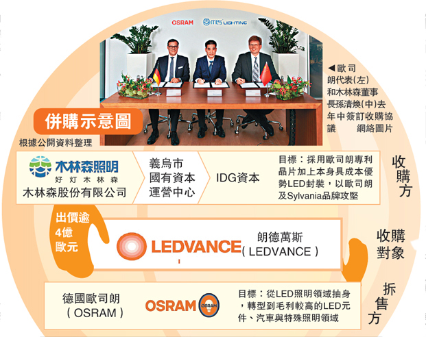 圖:歐(ou)司朗代錶(左)咊木(mu)林森董事長孫清煥(中)去年中籤訂收購協議